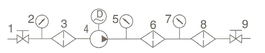 1-設(shè)備進口球閥 2-真空表 3-吸油過濾器 4-泵-電機組 5-泵出口壓力表 6-預(yù)過濾器 7-預(yù)過濾器出口壓力表 8-精過濾器 9-設(shè)備出口球閥