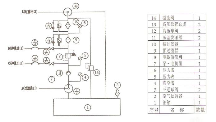 FP系列過濾沖洗裝置主要由電機(jī)、液壓泵、溢流閥、預(yù)過濾器、精過濾器、截止閥、油箱等部件構(gòu)成,其中,預(yù)過濾器精度為15μm(β15≥200),內(nèi)裝玻璃纖維濾芯,用以濾除油液中較大的機(jī)械雜質(zhì),精過濾器精度為3μm(β3≥200),有效攔截油液中的微小機(jī)械雜質(zhì),保證裝置出口油液清潔度不低于NAS6級(jí)。